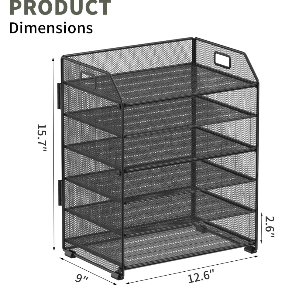 This six-tier desk organiser is constructed from heavy-duty thick metal for supporting heavy files. Each tier holds letter-size documents. The black finish provides a professional appearance.