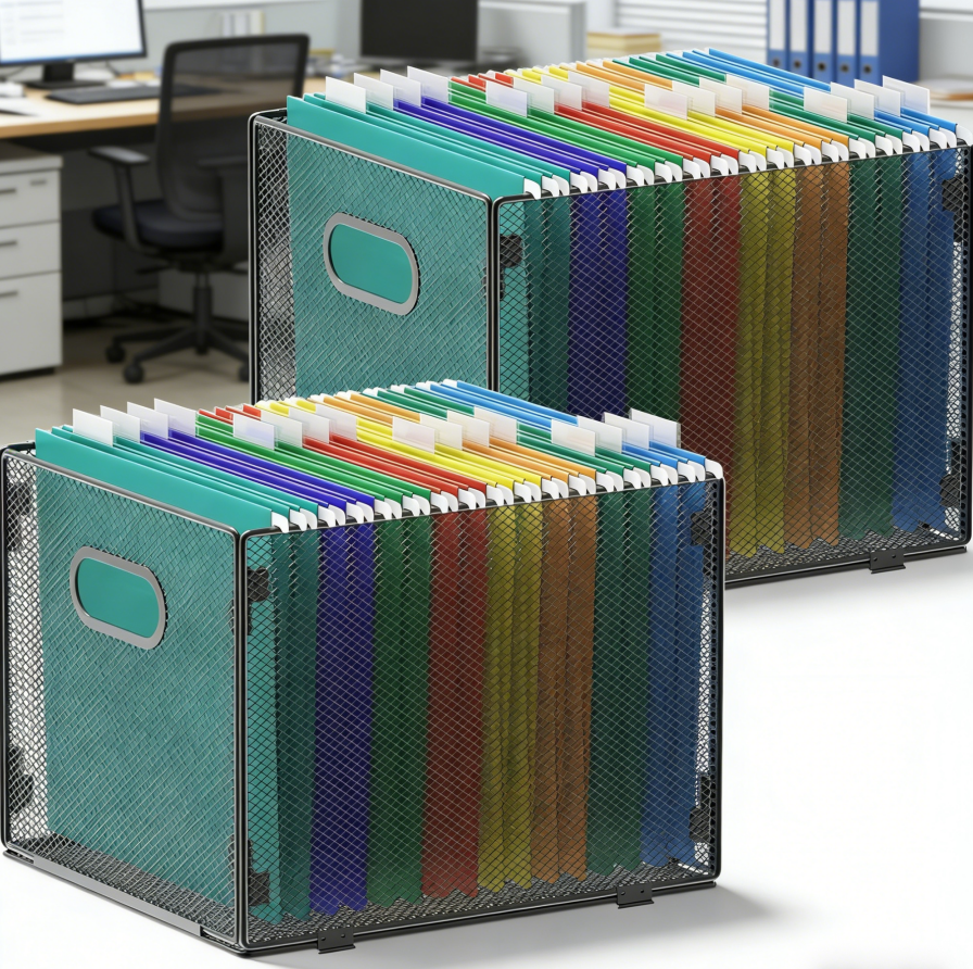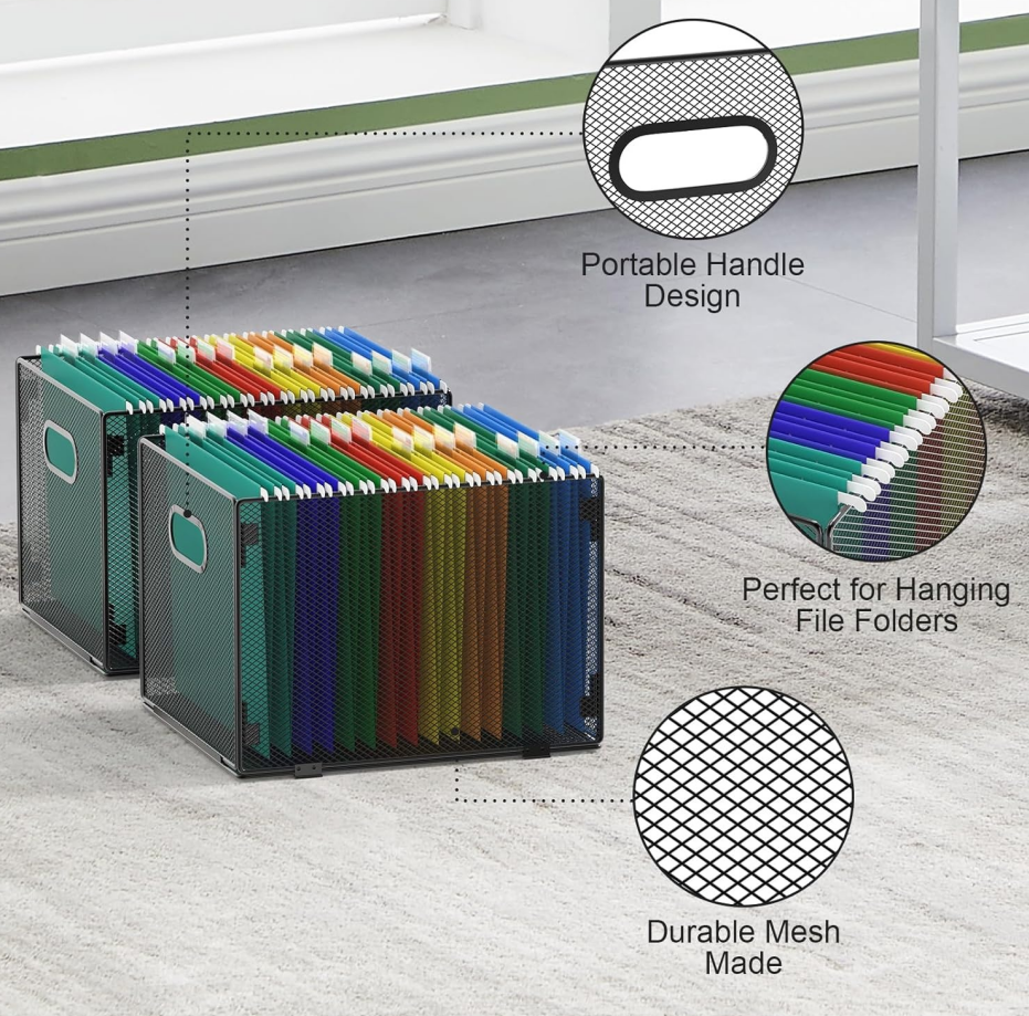 The boxes can be used as portable filing boxes or placed inside cabinets. They serve as file cabinet organisers for categorising documents. The open mesh design prevents dust accumulation.