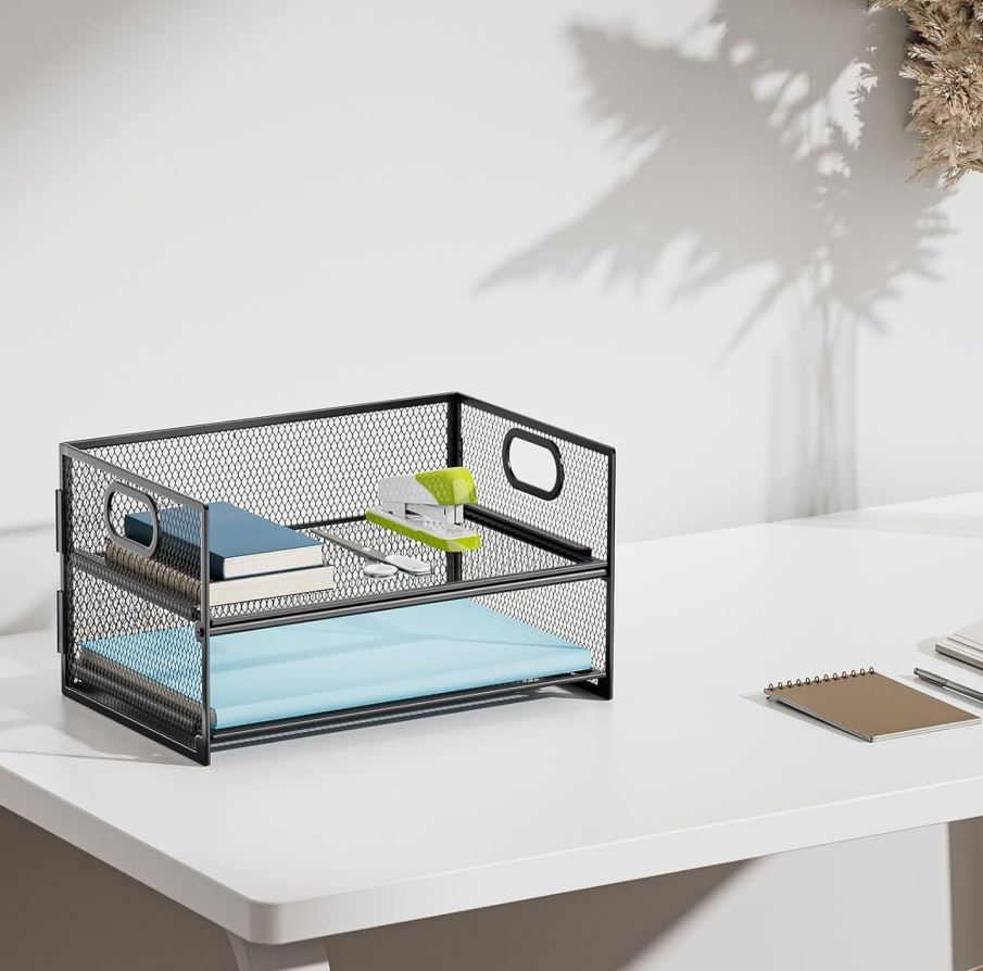This two-tier mesh organiser includes a handle for easy repositioning on the desk. It functions as a paper sorter for letter-size documents and home office supplies. The black mesh construction allows visibility of contents in both tiers.