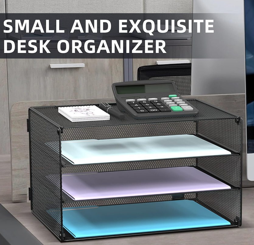 This three-tier mesh metal organiser is designed for letter-size paper storage in home and office settings. Each tier is accessible from the front, allowing users to slide documents in and out. The black finish coordinates with standard furniture.