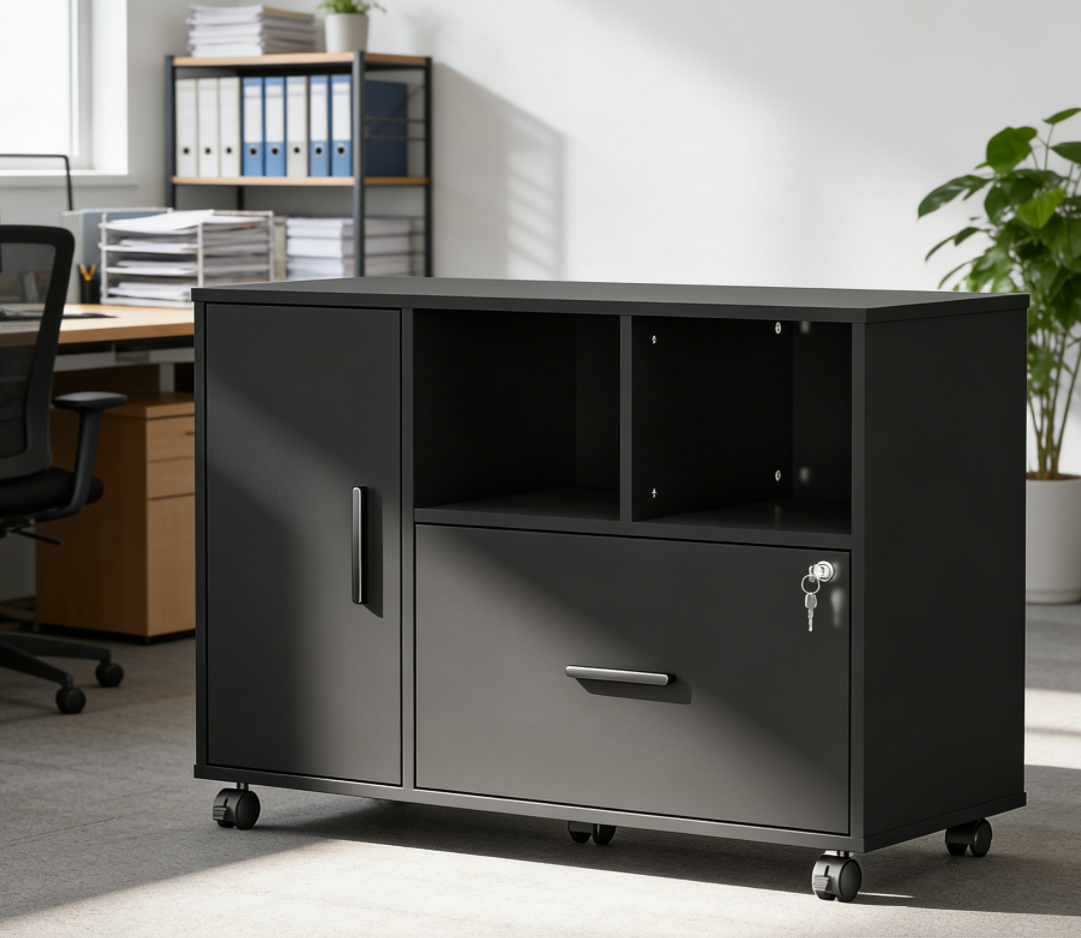 This black wood file cabinet features one drawer and includes a lock. It functions as a lateral filing cabinet on wheels and a mobile printer stand. The cabinet includes an open storage shelf and accepts letter, legal, and A4 size files.