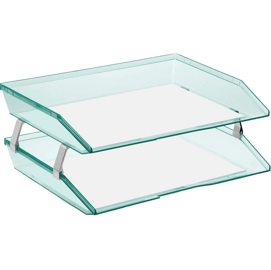 This two-tier organiser is made from clear green plastic, allowing visibility of contents in both levels. It accepts letter-size and A4 documents through side-loading openings. The stackable configuration saves horizontal desk space.