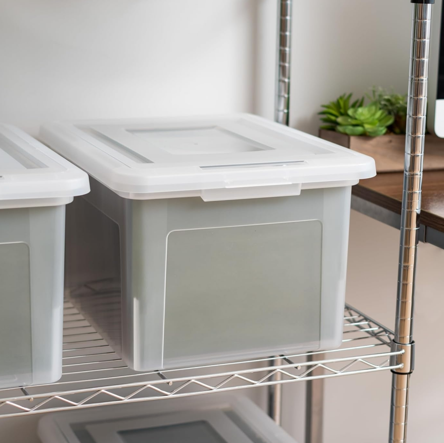 This clear plastic file box has a 35-quart capacity and includes a latching lid. It is intended for letter and legal size hanging files. The box functions as a document organiser and storage bin.