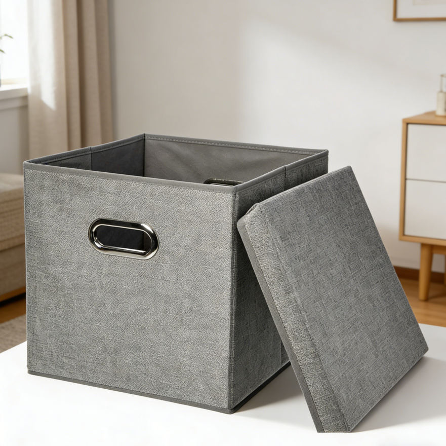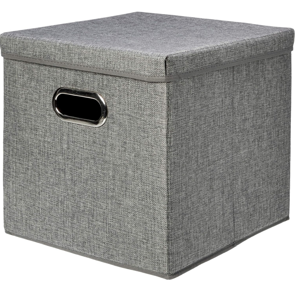 This set of two gray storage bins is made from foldable burlap cloth. Each bin includes a lid and can be stacked when not in use. The cube shape suits shelves or desk-side storage.